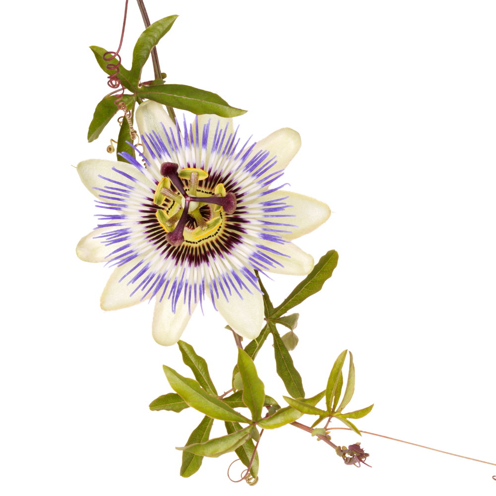 Passionflower (Passiflora incarnata) – traditionally used to quiet racing thoughts, ease anxiety, and support nervous system regulation. It is particularly helpful during moments of agitation, irritability, and overstimulation when it feels difficult to relax or fully enjoy life. Passionflower gently relaxes the body while calming excessive mental chatter and hyperactivity.